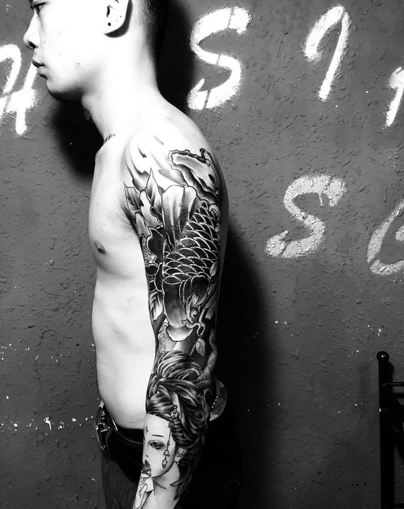 当前位置: 首页 >广东省东莞市纹身店-张扬刺青纹身图案>花臂鲤鱼艺妓纹身图片