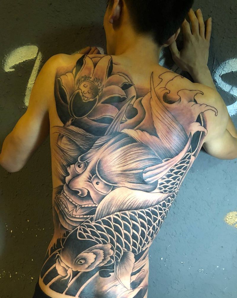 当前位置: 首页 >广东省东莞市纹身店-张扬刺青纹身图案>满背鲤鱼般诺纹身图片