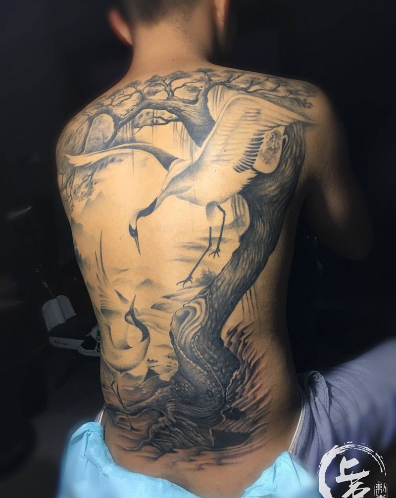 当前位置: 首页 >广东省清远市纹身店-上若刺青纹身图案>松鹤纹身图片_背部纹身图案