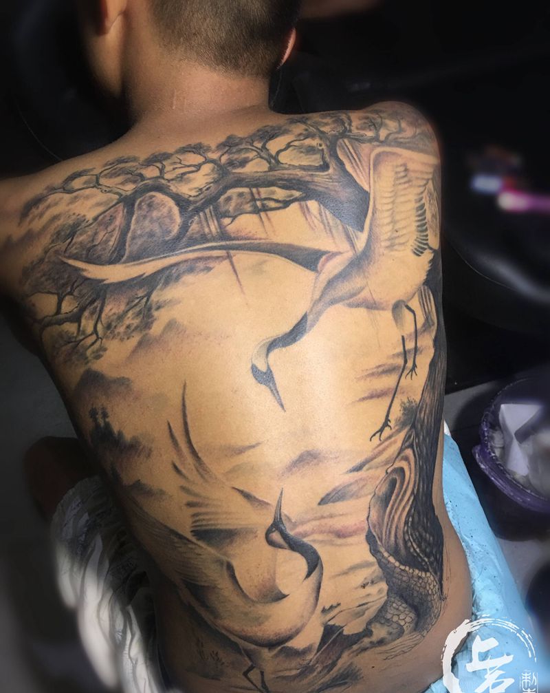 松鹤纹身图片_背部新传统纹身图案