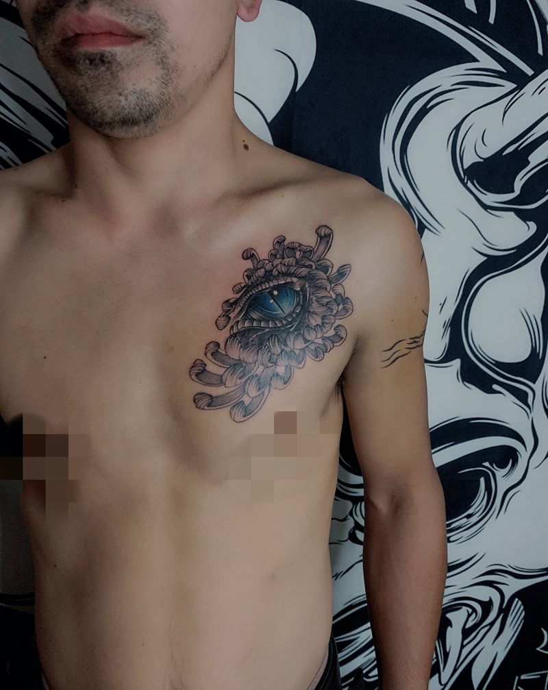 诱惑之眼纹身图片_胸部欧美写实水墨纹身图案