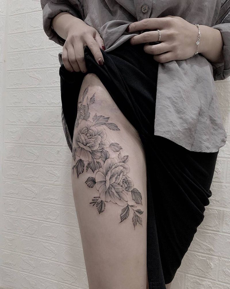 素花作品纹身图片_腿部水墨点刺纹身图案