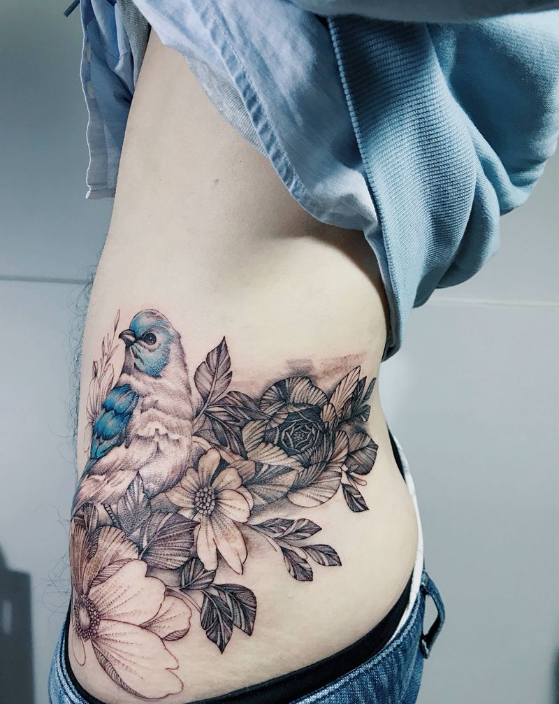 素花胎记覆盖纹身图片_腰部点刺纹身图案