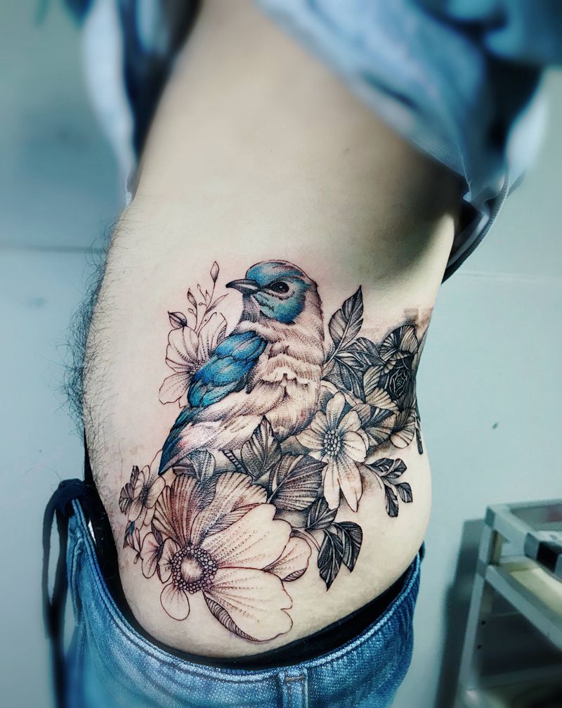 素花胎记覆盖纹身图片_腰部点刺纹身图案