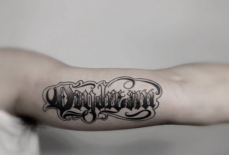 当前位置: 首页 >广东省东莞市纹身店-刺青堂纹身纹身图案>哥特英文花臂纹身图片_手臂手部花体字纹身图案