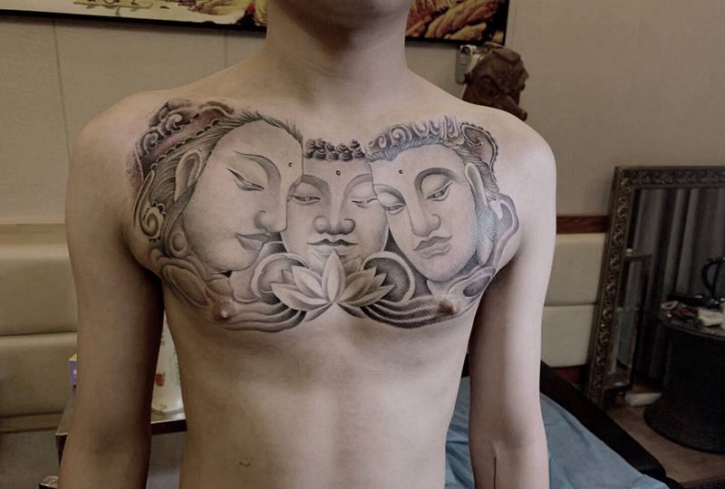 三面佛纹身图片_胸部新传统水墨纹身图案