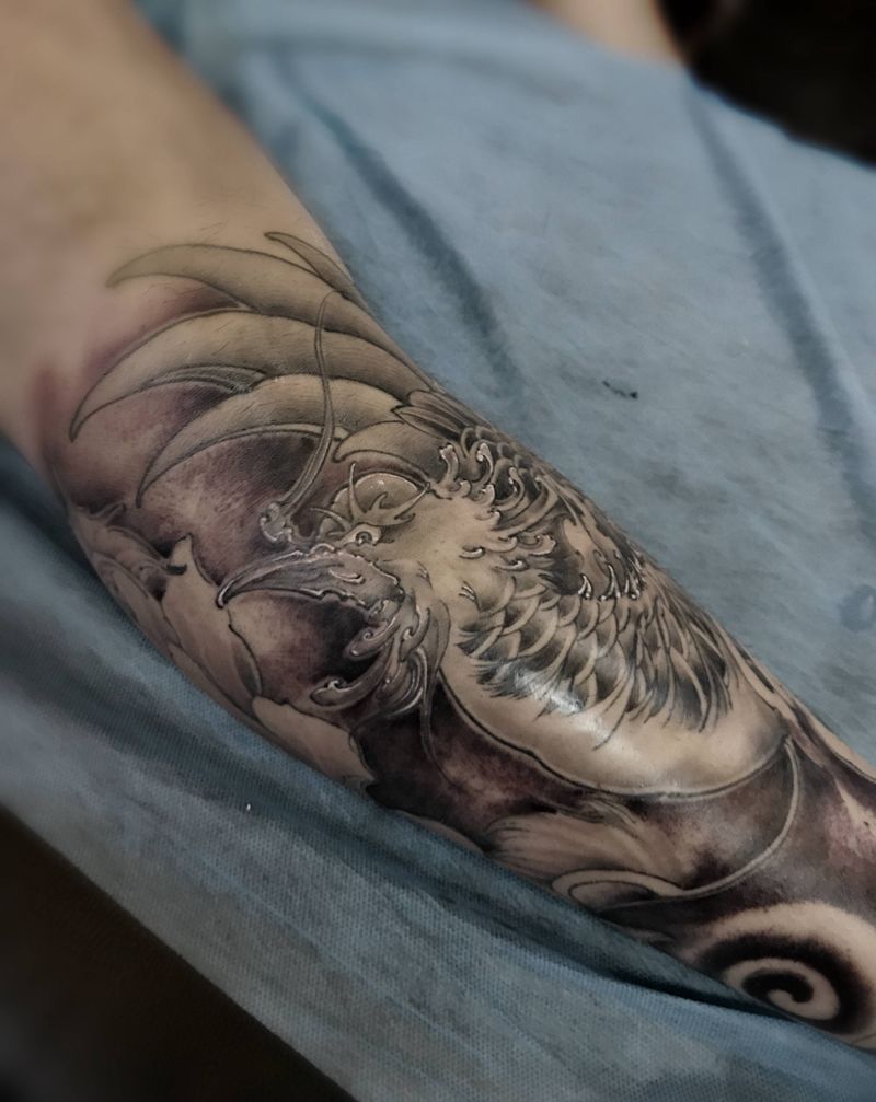 • T网红王老大花腿龙纹身图片_腿部新传统纹身图案
