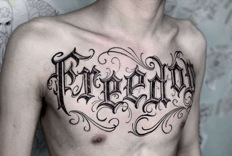 哥特英文花体纹身图片_胸部花体字欧美写实纹身图案
