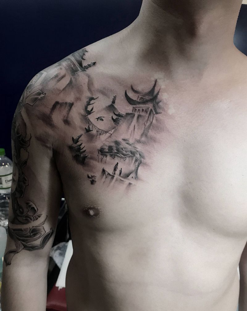 半胛山水观音作品纹身图片_胸部手部水墨新传统纹身图案