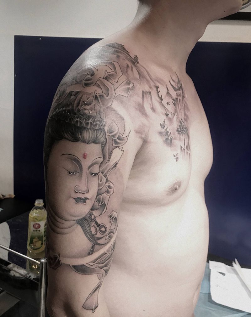 半胛山水观音作品纹身图片_胸部手部水墨新传统纹身图案