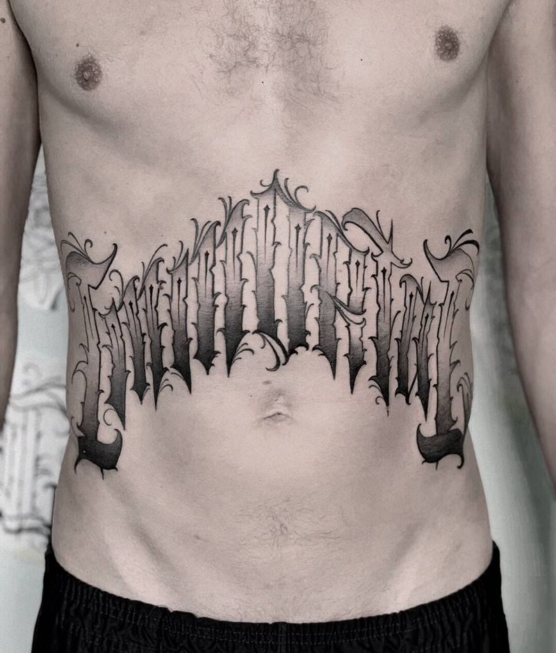 哥特英文花纹身图片_腹部欧美写实花体字纹身图案