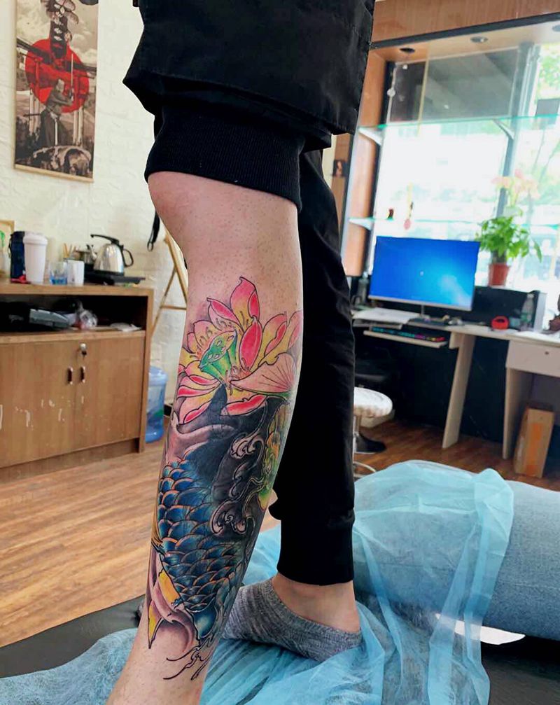 • T网红王老大花腿龙纹身图片_腿部新传统纹身图案
