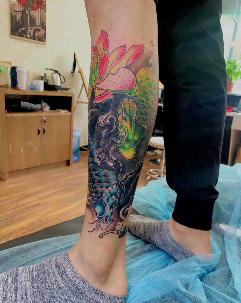 • T网红王老大花腿龙纹身图片_腿部新传统纹身图案