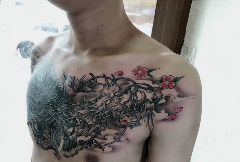 花胸遮盖作品纹身图片_胸部新传统水墨纹身图案
