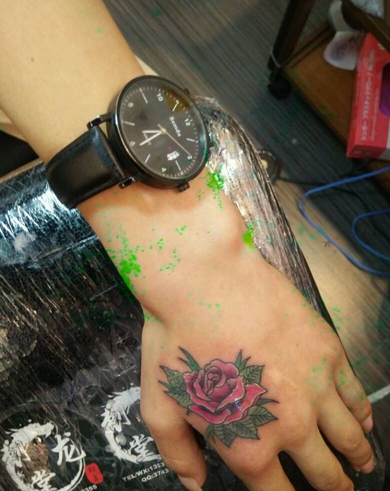 • 手背潮流时尚的玫瑰花眼睛纹身图案