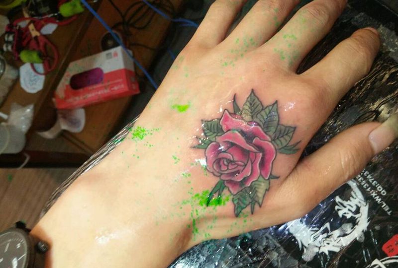 • 手背潮流时尚的玫瑰花眼睛纹身图案