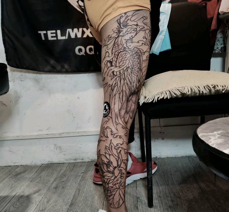 • T网红王老大花腿龙纹身图片_腿部新传统纹身图案