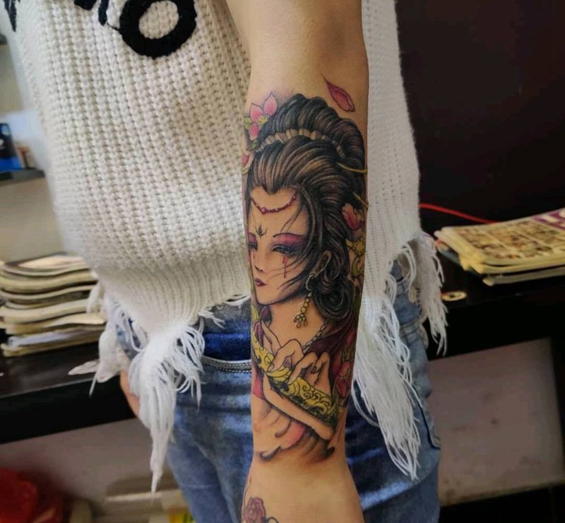 当前位置: 首页 >广东省东莞市纹身店-刺龙堂纹身纹身图案>艺伎纹身图片_手臂新传统纹身图案