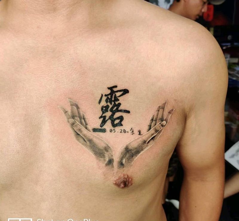 手坐纹身图片_胸部欧美写实纹身图案