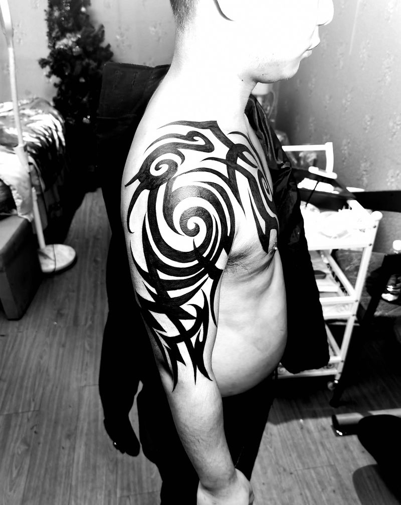 当前位置: 首页 >广东省中山市纹身店-强子刺青纹身图案>半甲图腾纹身图片_肩部胸部新传统图腾纹身图案