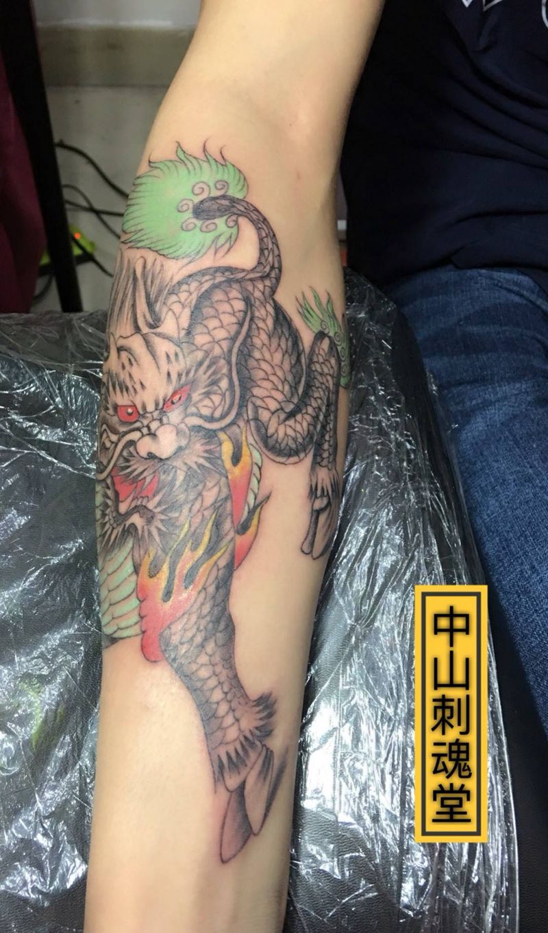• T网红王老大花腿龙纹身图片_腿部新传统纹身图案