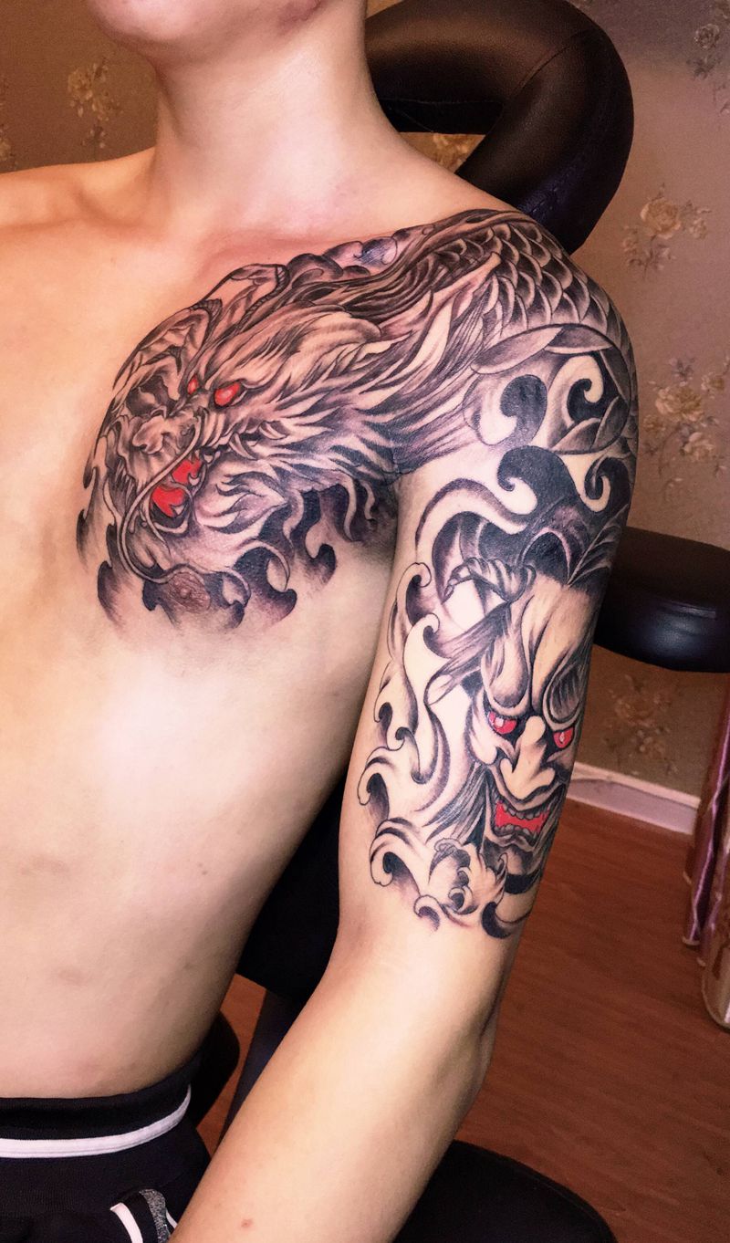 龙半甲纹身图片_胸部手臂新传统纹身图案