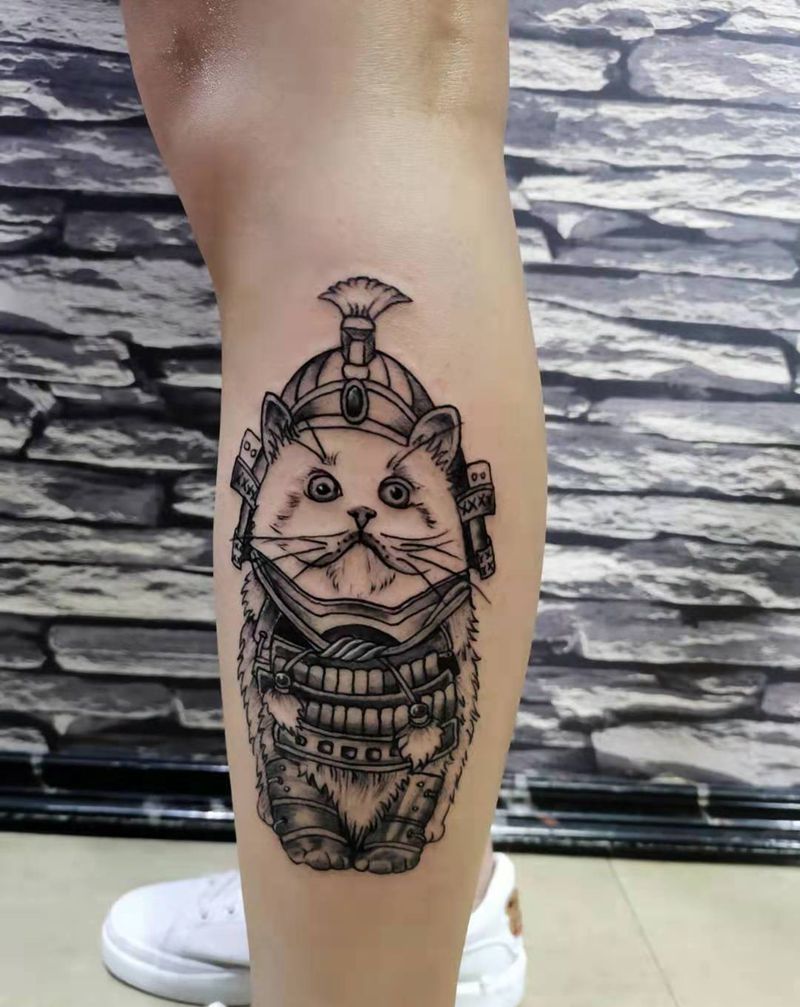 武士猫咪驻店作纹身图片_腿部欧美写实点刺纹身图案