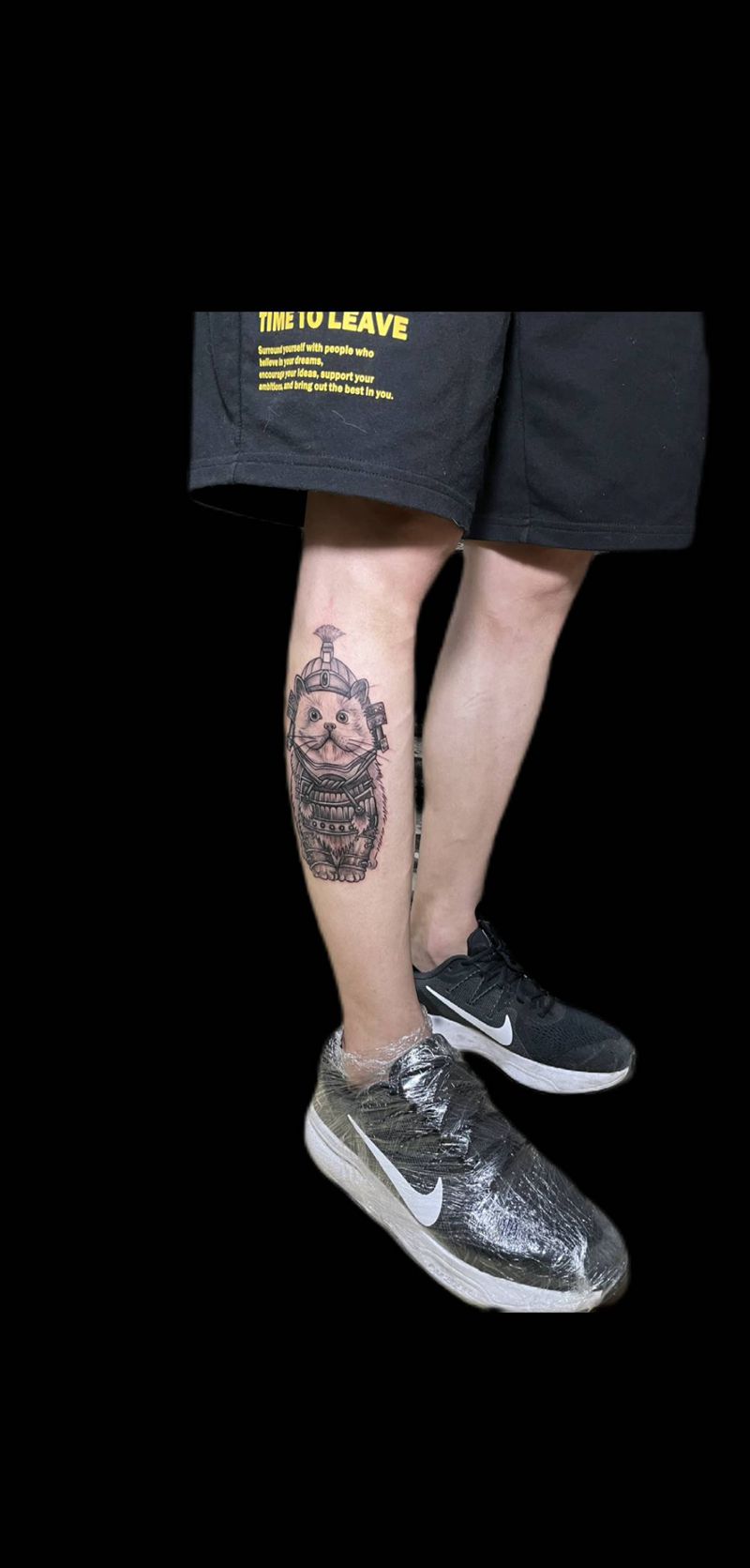 武士猫咪纹身图片_腿部欧美写实点刺纹身图案