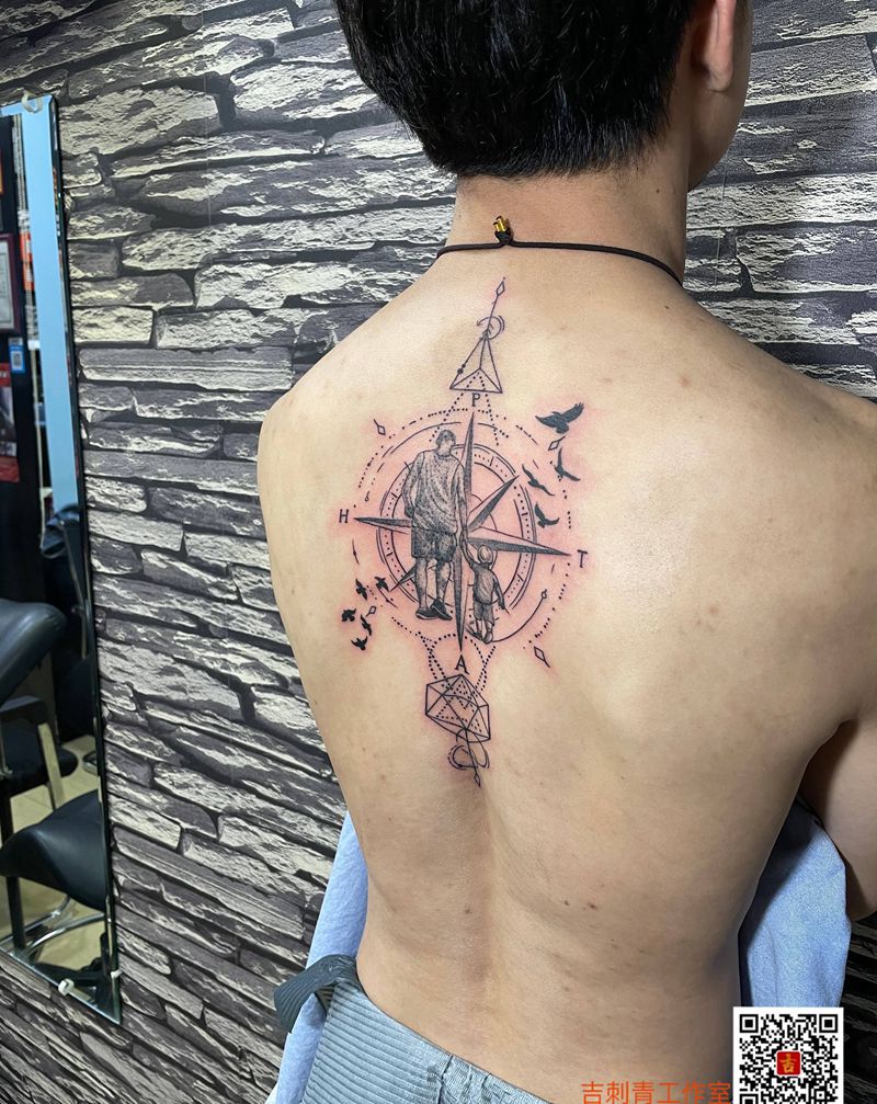 父爱指南针纹身图片_背部欧美写实水墨纹身图案