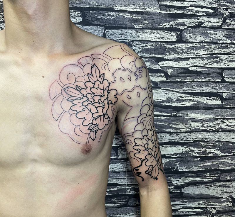 当前位置: 首页 >广东省中山市纹身店-吉刺青纹身图案>牡丹主题半甲线条纹身图片_手臂老传统纹身图案