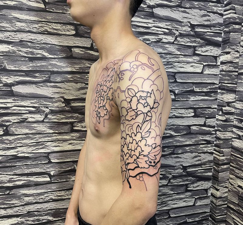当前位置: 首页 >广东省中山市纹身店-吉刺青纹身图案>牡丹主题半甲线条纹身图片_手臂老传统纹身图案