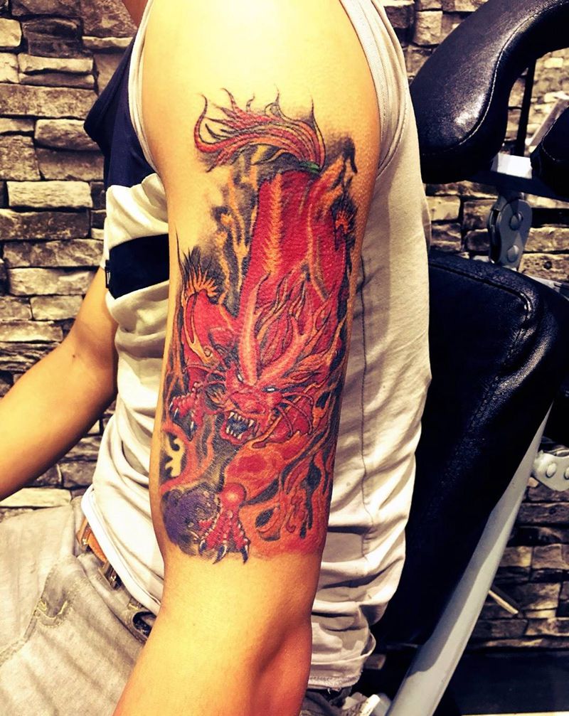 • T网红王老大花腿龙纹身图片_腿部新传统纹身图案