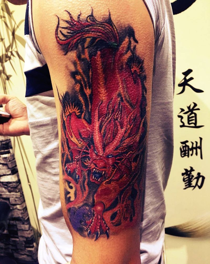 • T网红王老大花腿龙纹身图片_腿部新传统纹身图案
