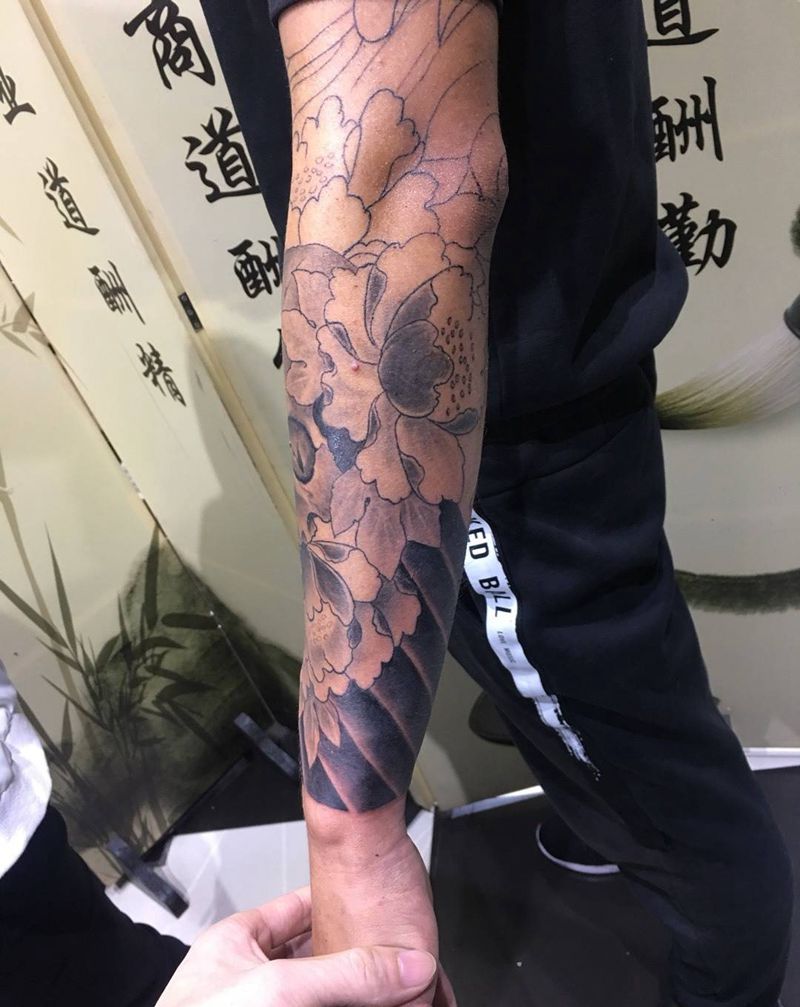 当前位置: 首页 >广东省中山市纹身店-吉刺青纹身图案>艺妓骷髅花臂纹身图片