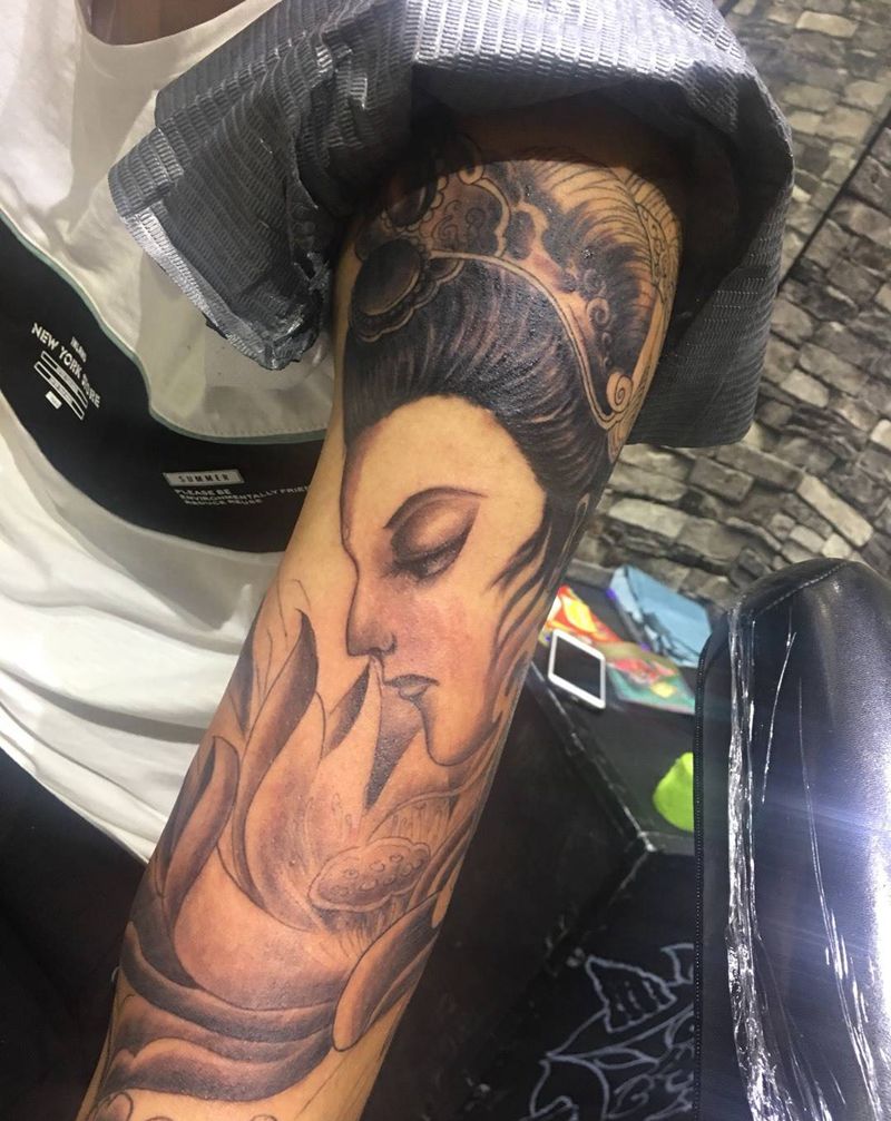 当前位置: 首页 >广东省中山市纹身店-吉刺青纹身图案>艺妓骷髅花臂纹身图片