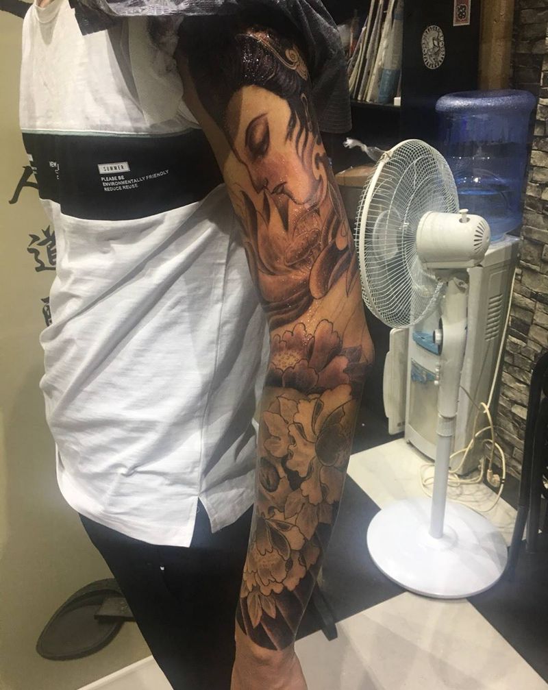 艺妓骷髅花臂纹身图片