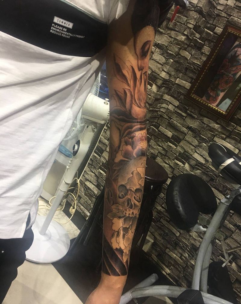 当前位置: 首页 >广东省中山市纹身店-吉刺青纹身图案>艺妓骷髅花臂纹身图片