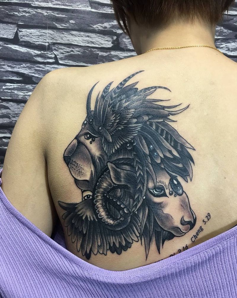 狮子座守护白羊座纹身图片_背部欧美写实纹身图案