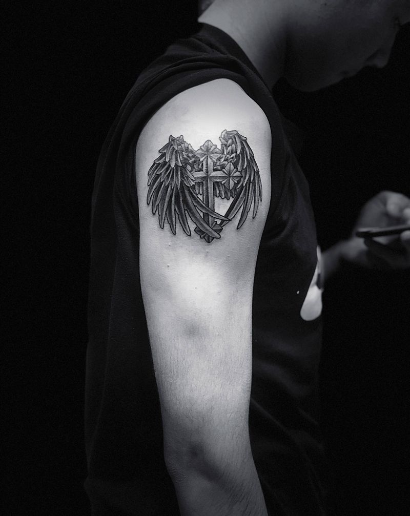 十字架翅膀纹身图片_手臂水墨纹身图案