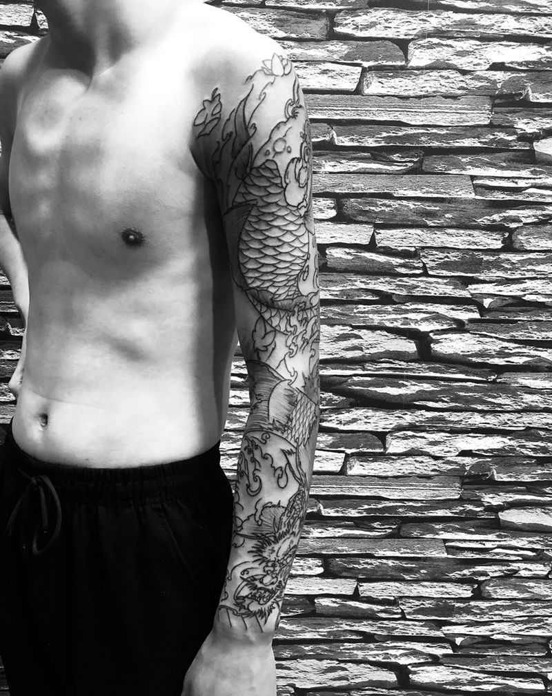 当前位置: 首页 >广东省中山市纹身店-吉刺青纹身图案>新传统鲤鱼花臂线条纹身图片_手臂新传统纹身图案