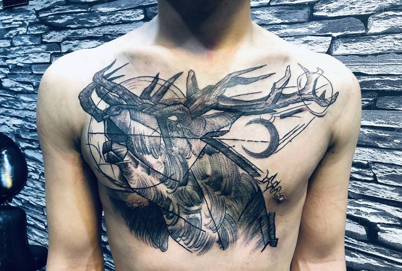 暗黑点线鹿首纹身图片_胸部点刺纹身图案