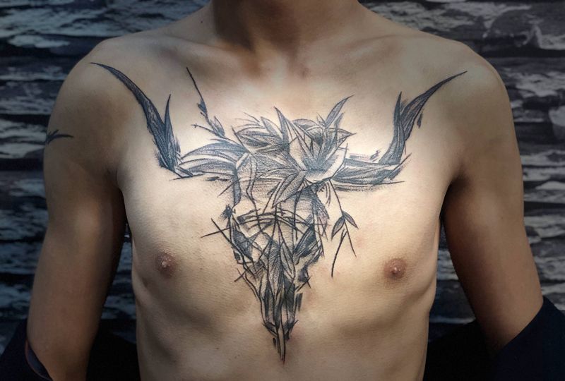暗黑点线风格羊首纹身图片_胸部点刺几何纹身图案
