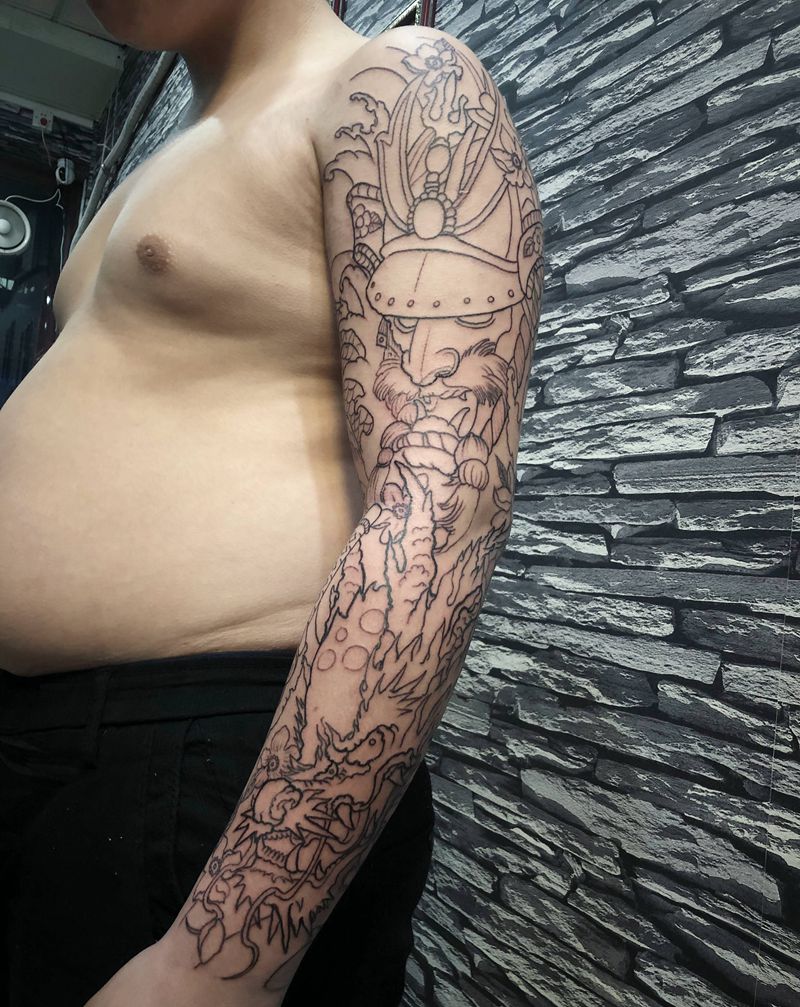 当前位置: 首页 >广东省中山市纹身店-吉刺青纹身图案>龙武士花臂线条纹身图片_手臂新传统纹身图案