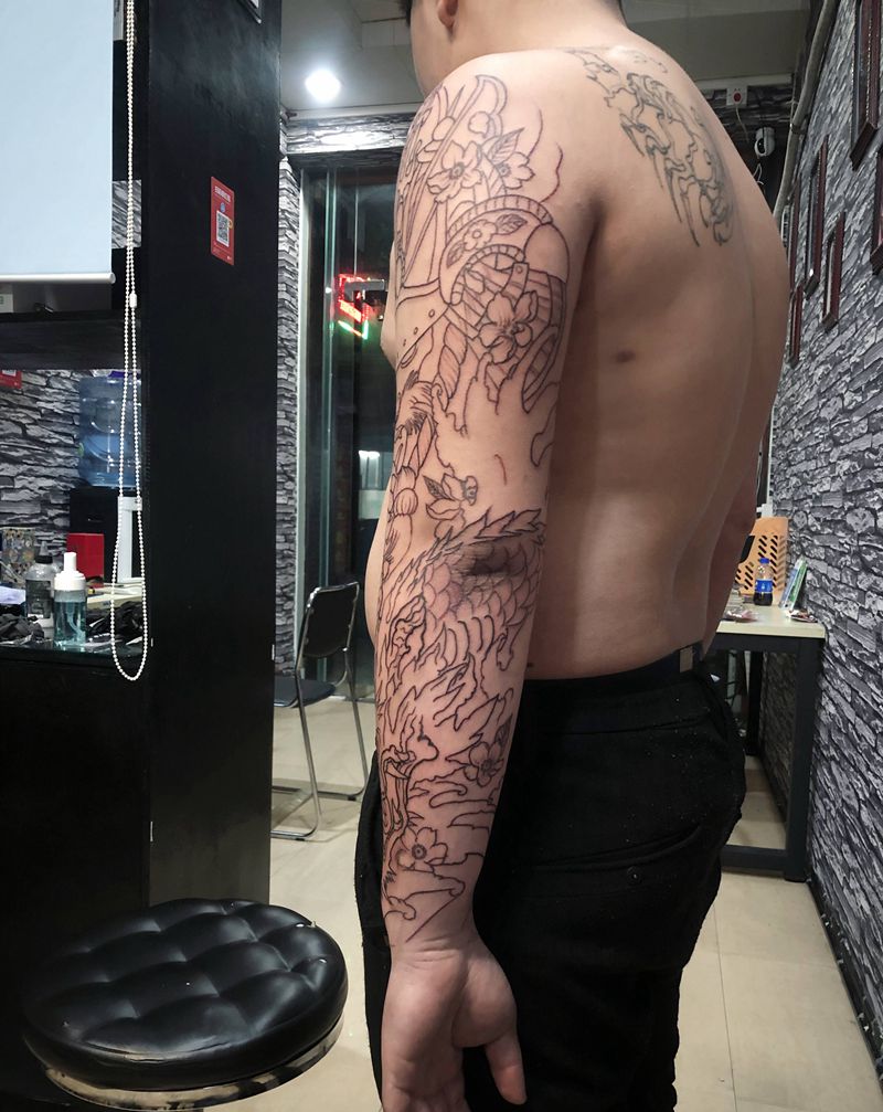 当前位置: 首页 >广东省中山市纹身店-吉刺青纹身图案>龙武士花臂线条纹身图片_手臂新传统纹身图案