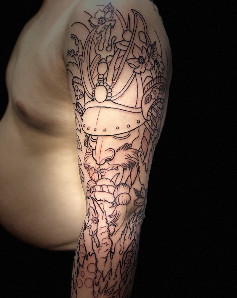 当前位置: 首页 >广东省中山市纹身店-吉刺青纹身图案>龙武士花臂线条纹身图片_手臂新传统纹身图案