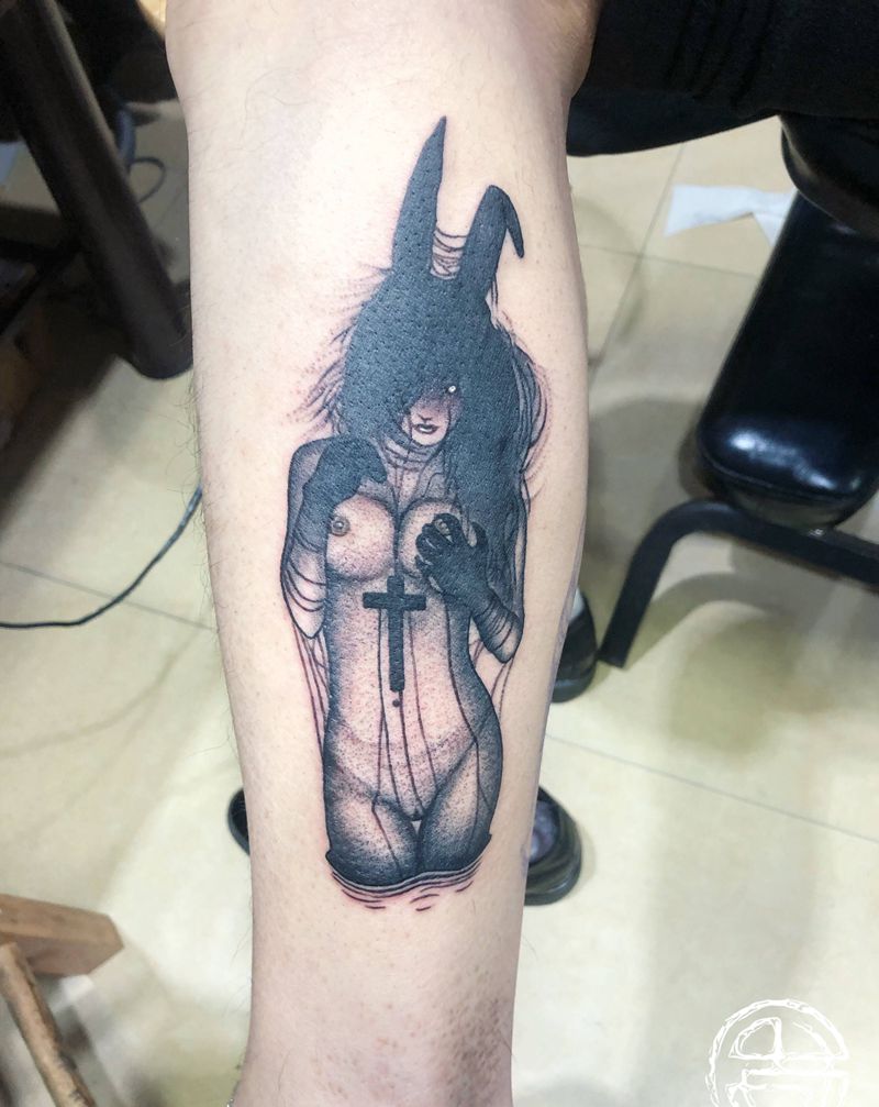 当前位置: 首页 >广东省中山市纹身店-吉刺青纹身图案>暗黑兔女郎纹身图片_脚部点刺纹身图案
