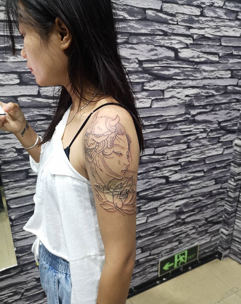 当前位置: 首页 >广东省中山市纹身店-吉刺青纹身图案>艺妓般若线条纹身图片_手臂新传统纹身图案