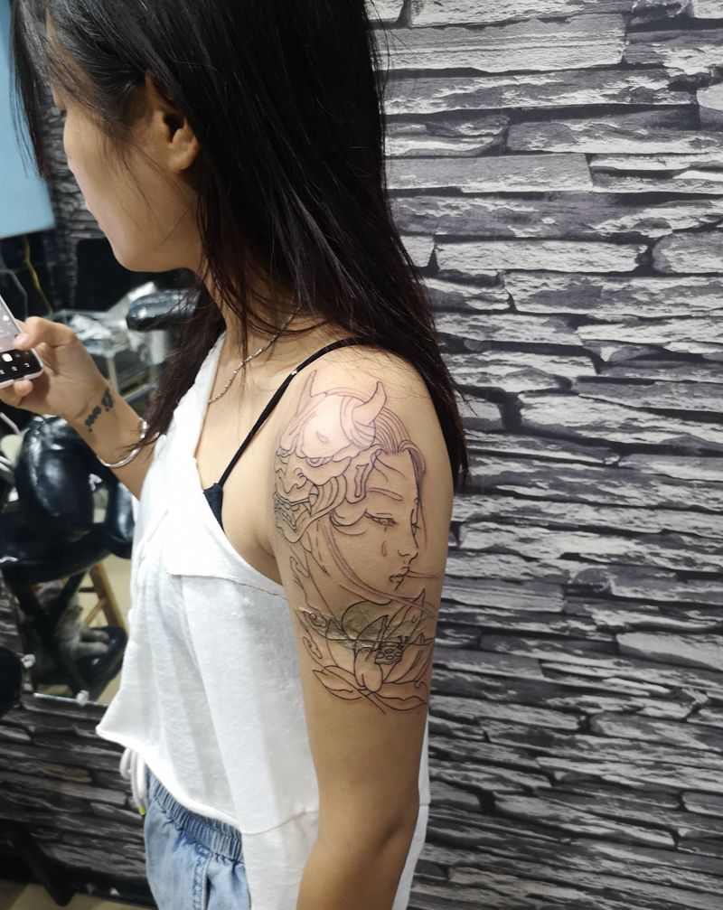 当前位置: 首页 >广东省中山市纹身店-吉刺青纹身图案>艺妓般若线条纹身图片_手臂新传统纹身图案