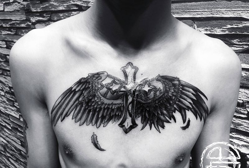 当前位置: 首页 >广东省中山市纹身店-吉刺青纹身图案>十字之翼纹身图片_胸部水墨纹身图案