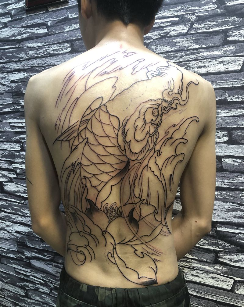 鲤鱼满背线条纹身图片_背部新传统纹身图案